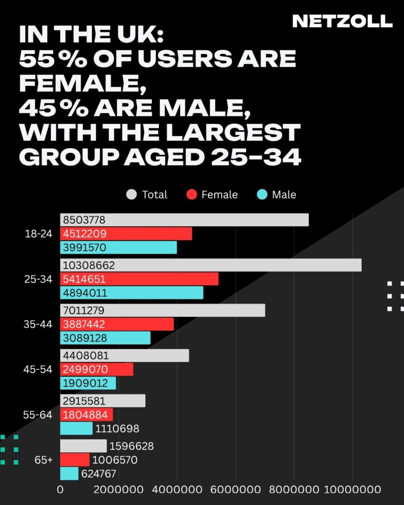 In the UK: 55 % of users are female, 45 % are male, with the largest group aged 25–34