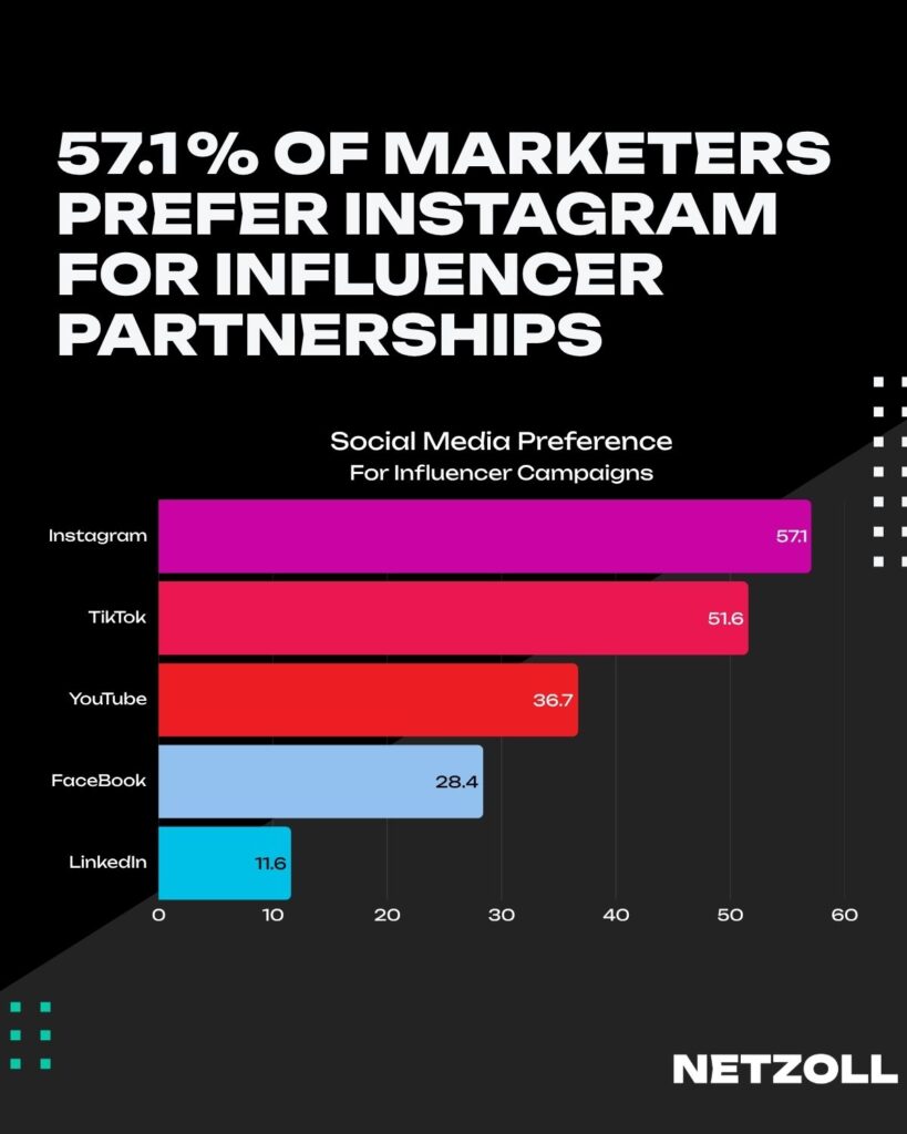 57.1 % of marketers prefer Instagram for influencer partnerships