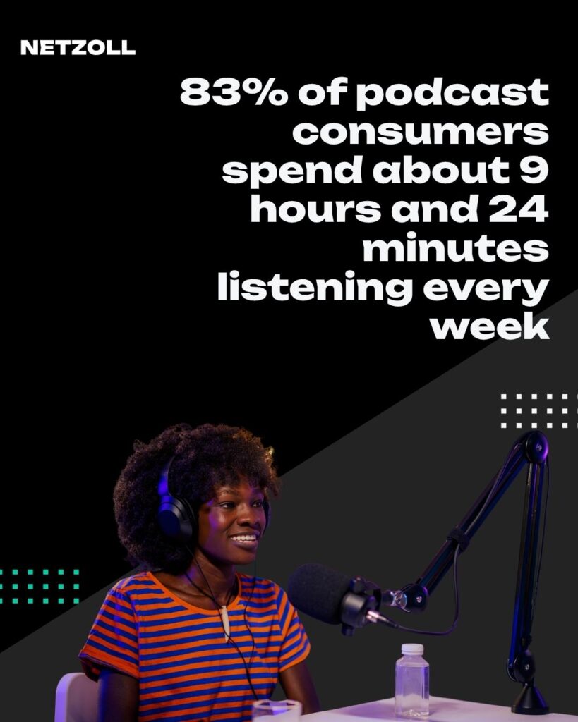 83% of podcast consumers spend about 9 hours and 24 minutes listening every week