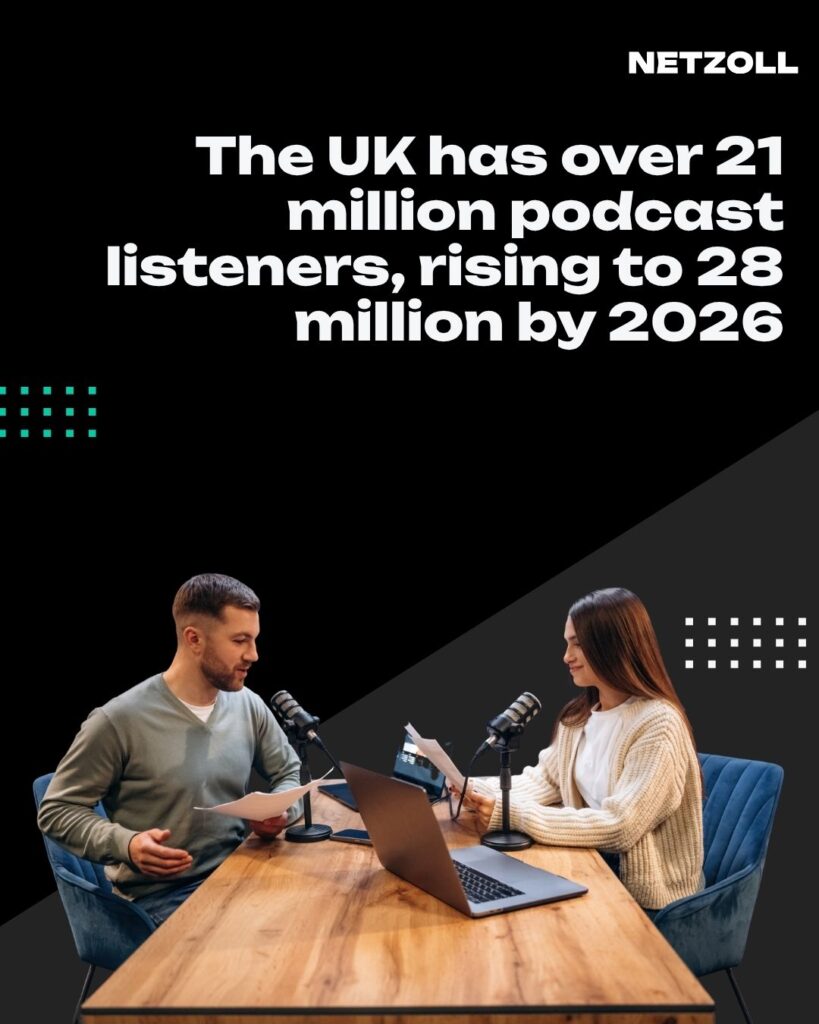 The UK is one of the strongest podcasting regions globally, with more than 21 million podcast listeners and forecasts suggesting 28 million within two years. For any SME targeting British audiences, this gives you a channel with both scale and depth.